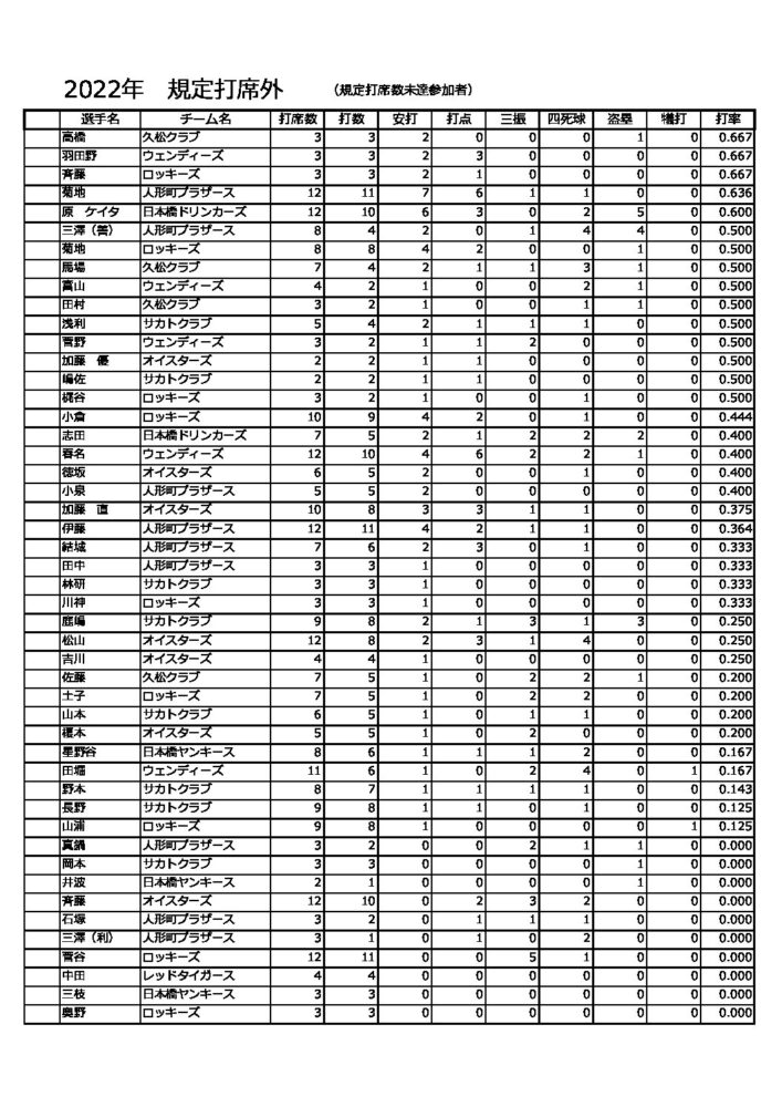 2022年度総合成績(規定打席外)