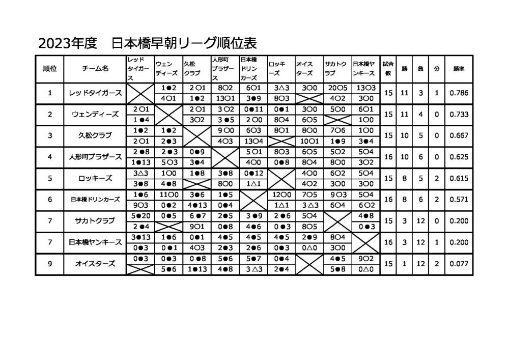 2023年リーグ勝敗表
