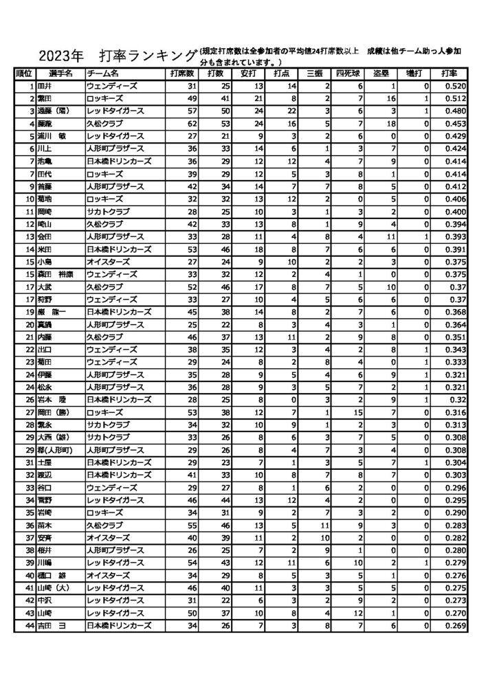 2023年度打率ランキング