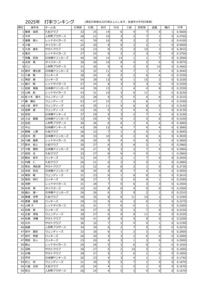 2025年度総合成績(規定打席)